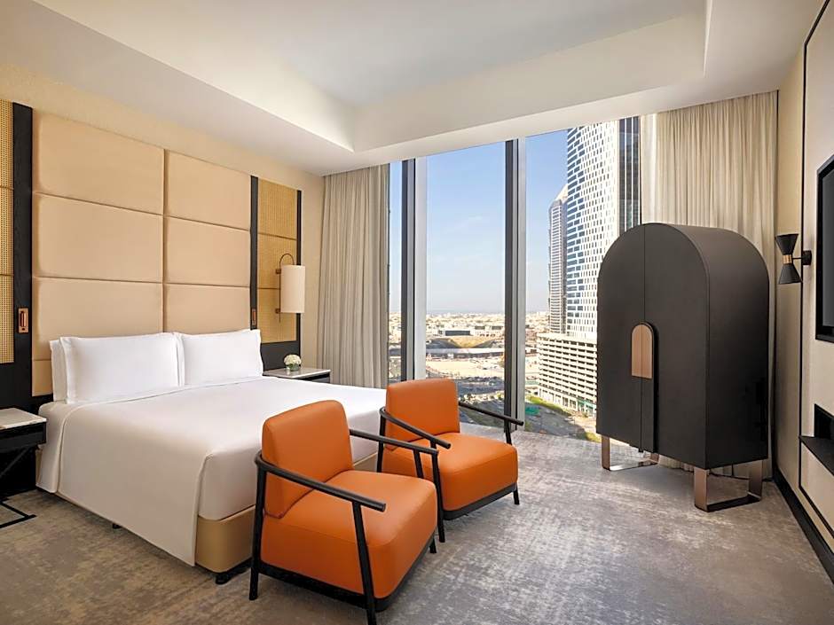 This spacious elegant suite is located on the higher floors and features a bedroom, a spacious living room that extends onto a balcony with floor-to-ceiling windows overlooking Business Bay. It includes a flat-screen TV, free Wi-Fi, a mini-bar, tea and coffee making facilities. The private bathroom is well appointed with a walk-in shower, a separate bathtub, a bidet, a hairdryer, and plush slippers for added comfort.